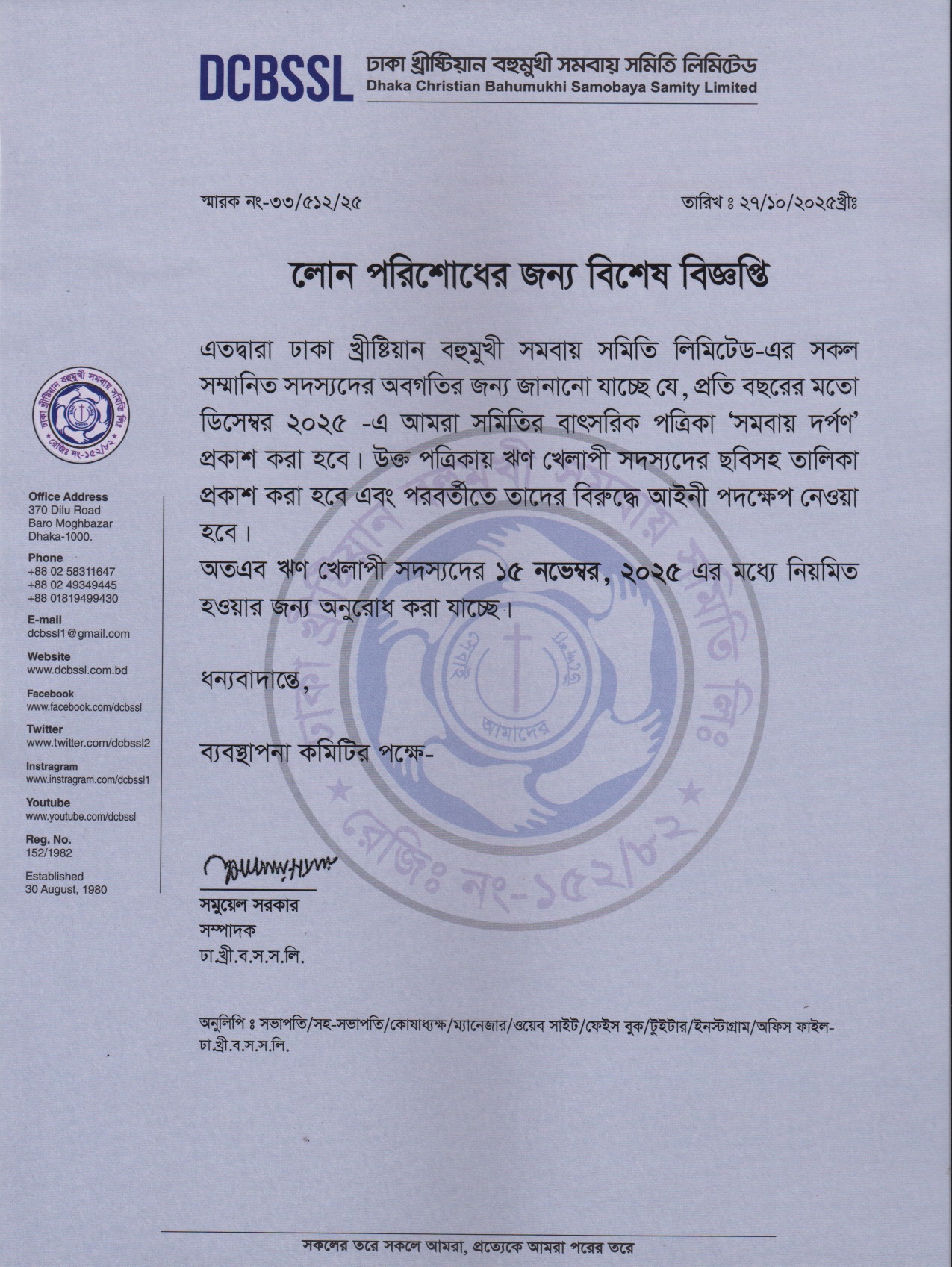 লোন পরিশোধের জন্য বিশেষ বিজ্ঞপ্তি